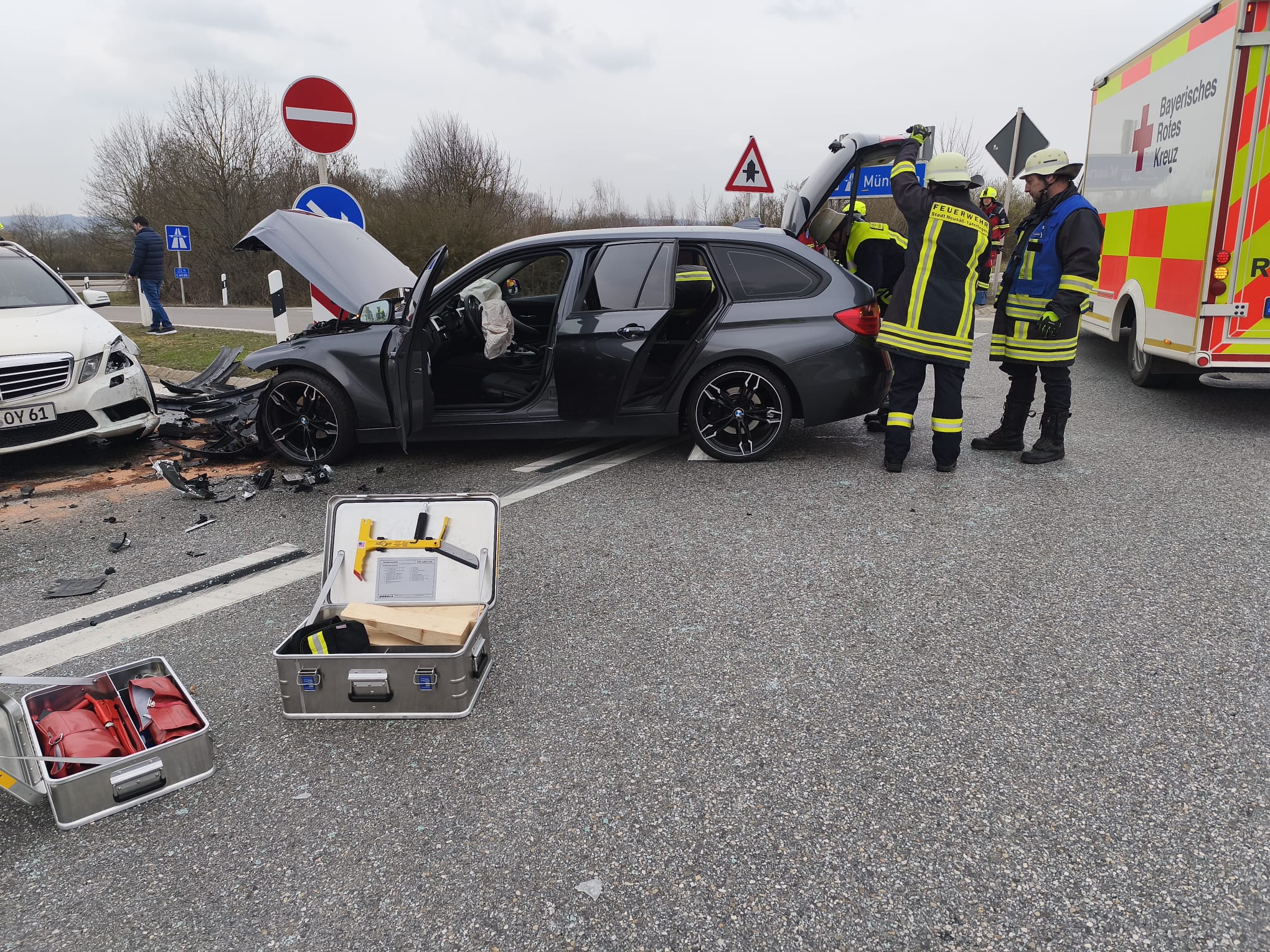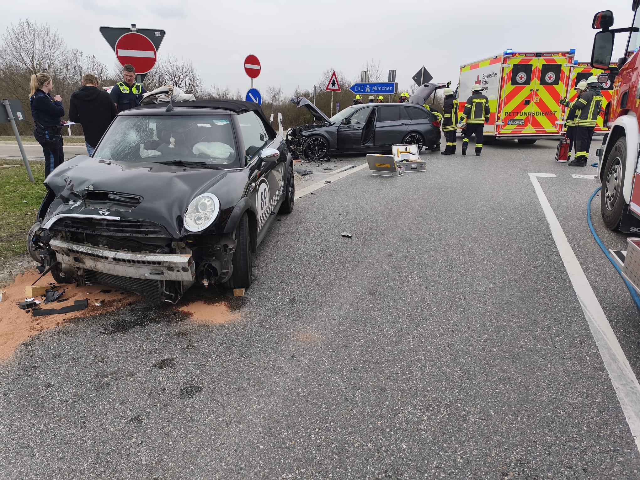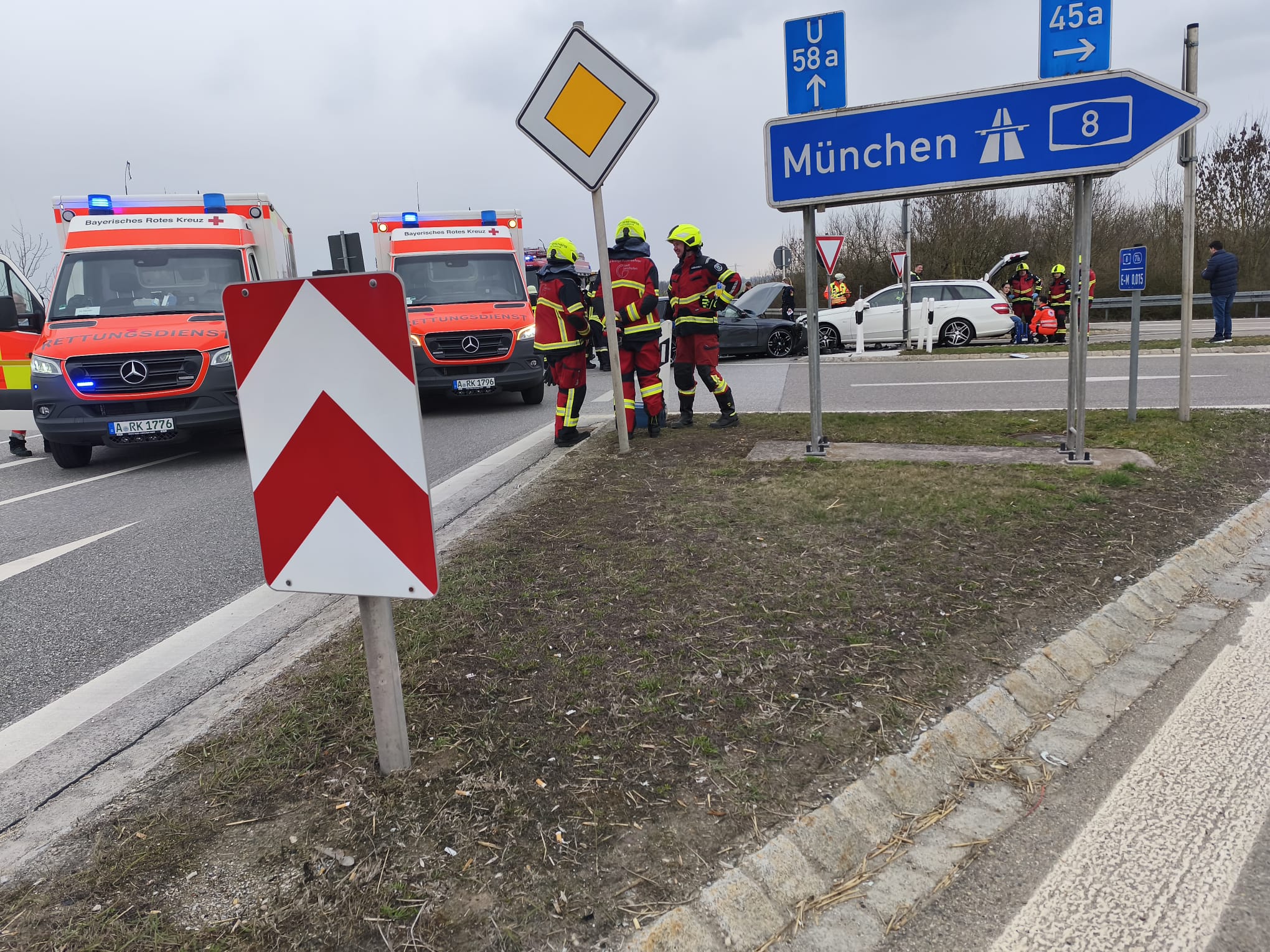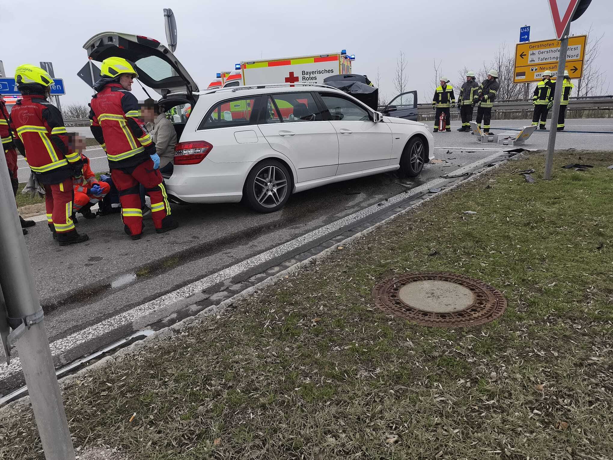 Durch einen ausgelösten eCall wurden die Feuerwehren aus Batzenhofen und Täfertingen auf die Autobahnbrücke alarmiert. Vor Ort kollidierten zwei PKW frontal, ein dritter PKW wurde durch den enormen Aufprall ebenfalls beschädigt. Insgesamt wurden sechs Personen leicht verletzt und in das UK Augsburg eingeliefert. Zur Unterstützung an der Einsatzstelle wurde im weiteren Verlauf die Feuerwehr Adelsried mit dem Verkehrssicherungsanhänger nachalarmiert um die Ausfahrt Neusäß in Fahrtrichtung München komplett zu sperren. Die Feuerwehren unterstützen den Rettungsdienst bei der Sichtung sowie Versorgung der Verletzten, sicherten die Einsatzstelle ab, nahmen auslaufende Betriebsstoffe auf und reinigten im Anschluss die Fahrbahn.